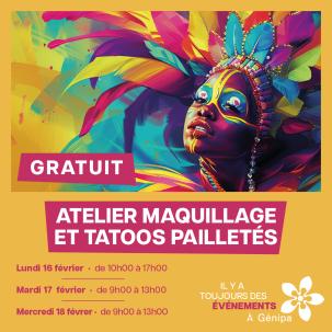 Carnaval à Génipa ! Venez profiter d’un atelier maquillage et tatouages pailletés 100% gratuit Pour petits et grands, laissez parler vos couleurs et votre créativité !
