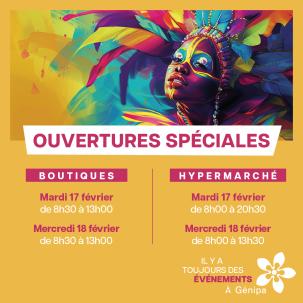 Ouvertures spéciales Carnaval à Génipa Pendant le Carnaval, les boutiques et l’hypermarché restent ouverts à Génipa. Profitez-en pour faire vos achats en toute tranquillité.