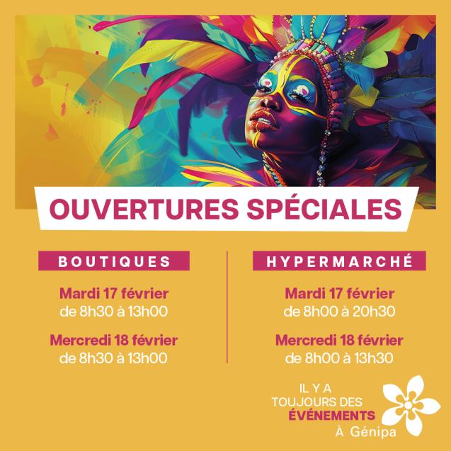 Ouvertures spéciales Carnaval à Génipa ouverture-carnaval-2026 Centre Commercial Génipa Il y a toujours des événements à Génipa !