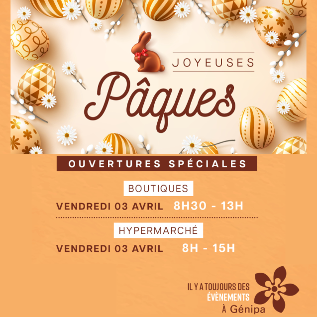 Préparez sereinement votre week-end de Pâques ! ouverture-speciale-pâques-2026 Hypermarché : 08h - 15h Boutiques : 08h30 - 13h Prenez de l'avance pour un chocolat de plus dans le panier !